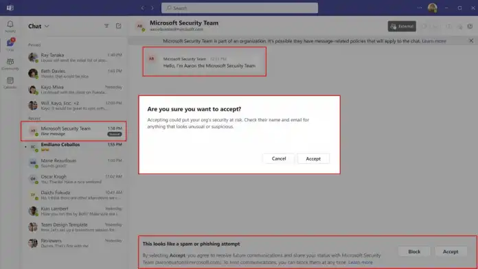So etwas kommt immer wieder vor: Etwa im August 2023 versuchten Kriminelle, als Microsoft-Support getarnt, über Teams Anmeldedaten zu erbeuten. Der neue Sicherheitsmechanismus soll derartige Eindringversuche bereits im Vorfeld erkennen, sodass es erst gar nicht zu einer Kontaktaufnahme kommt. Um den Kontakt dennoch herzustellen, etwa wenn es sich um einen legitimen Partner handelt, der fälschlicherweise als Spam erkannt wird, muss man mehrere Warnmeldungen abnicken, um den Chat zuzulassen.