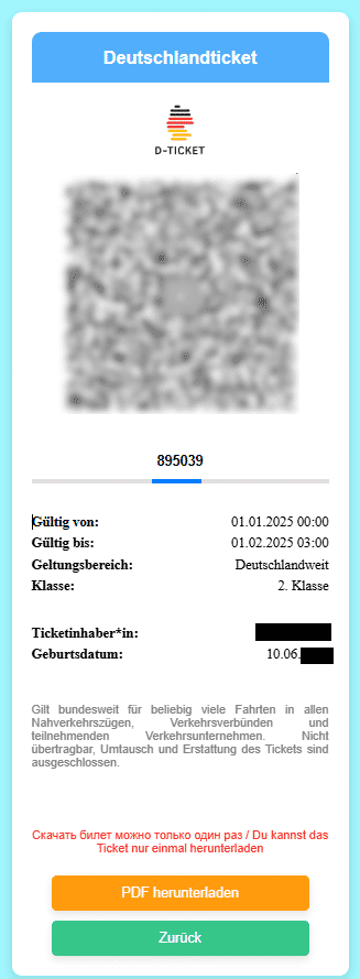 Die Webseite dticket.online bietet Deutschlandtickets an, kaufen kann man sie dort jedoch derzeit nicht. In einer älteren Fassung vom 31. Dezember 2024 verweist der Bestellen-Button auf den Telegram-Kanal @deutschland_ticket_flugtickets garniert mit dem folgenden russischen Text: